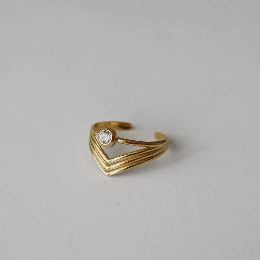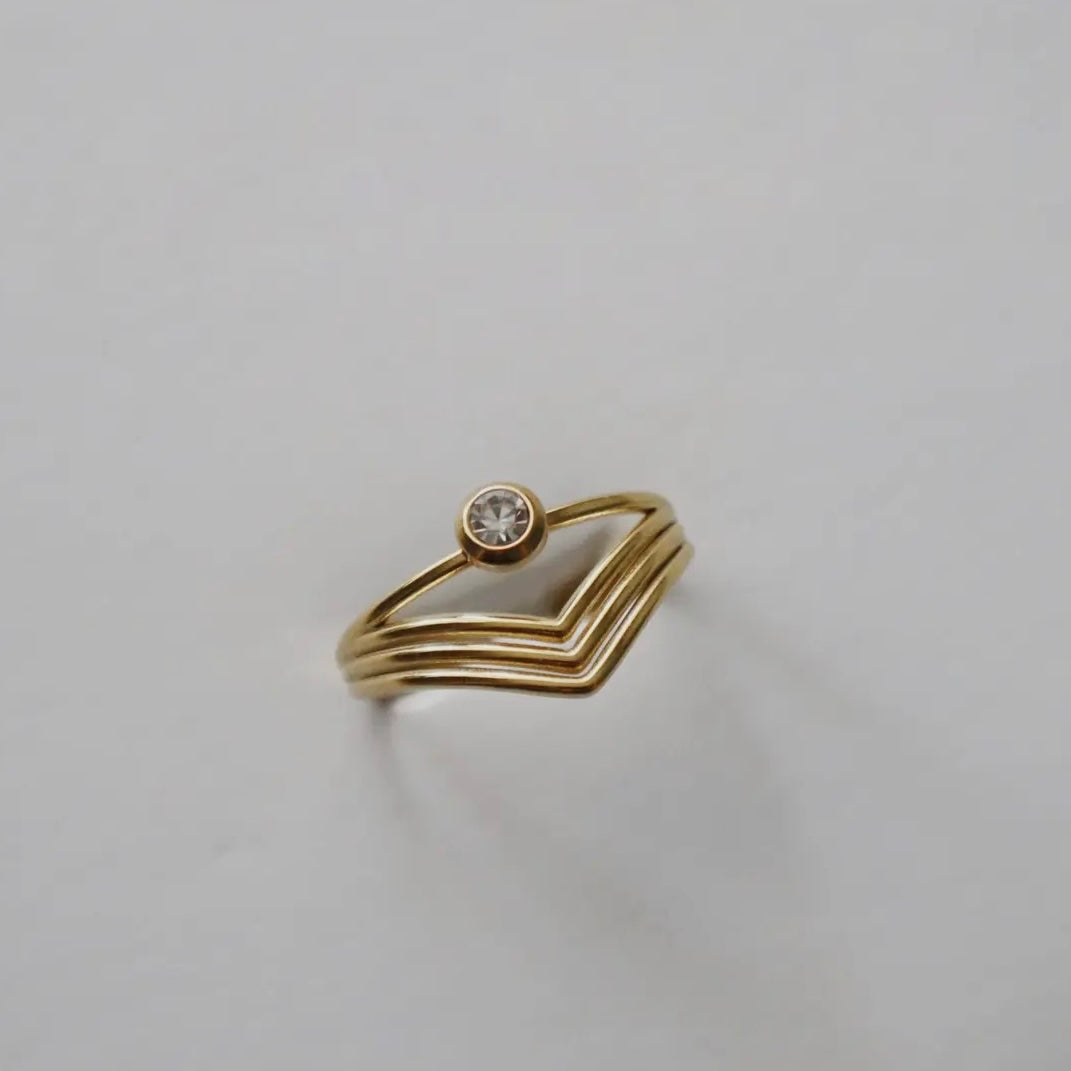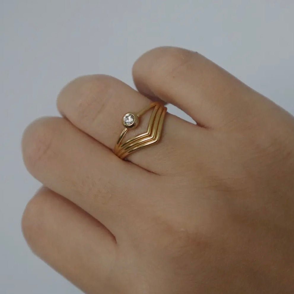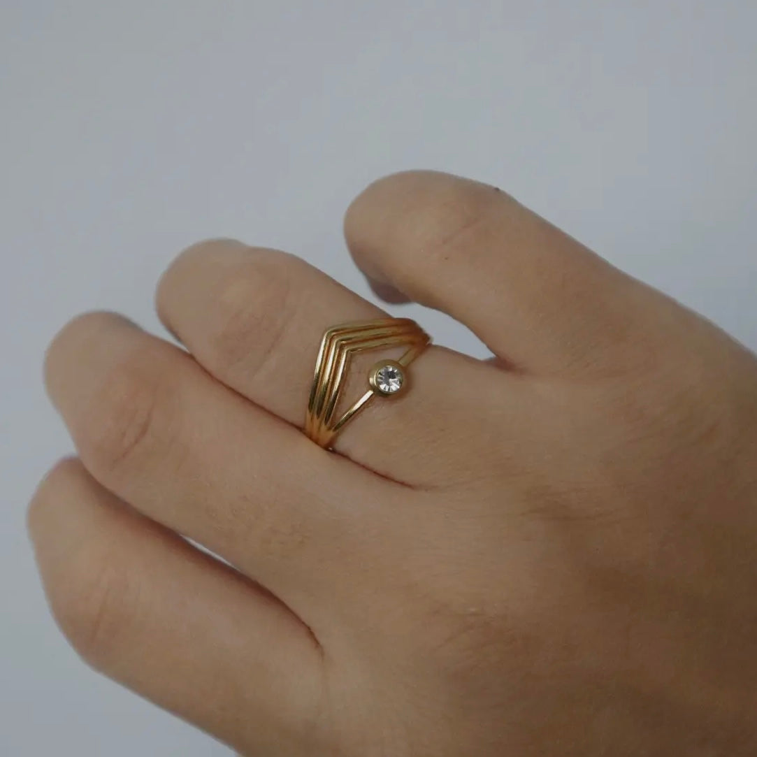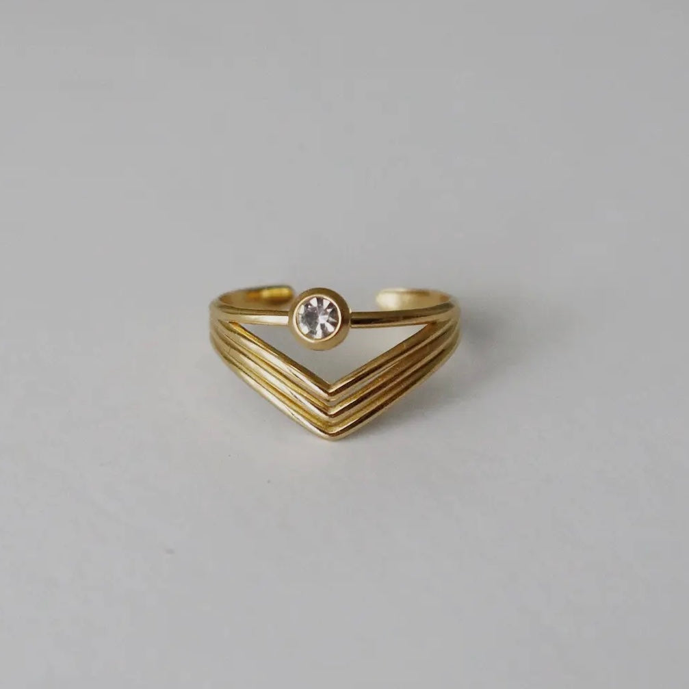 Gracefully crafted, this gold-tone ring exudes an ethereal charm with its layered, wave-like bands that converge into a stunning, singular crystal centerpiece. The geometric design symbolizes alignment and balance, while the radiant stone captures light, serving as a reminder of clarity and intention. Perfect for those seeking a blend of modern elegance and spiritual harmony.